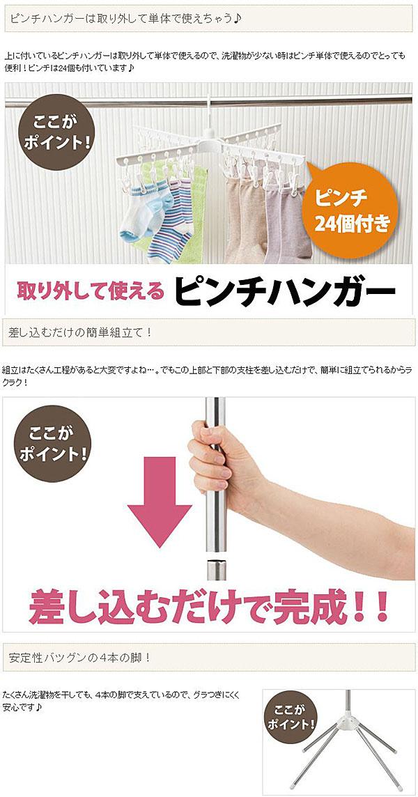 ●上に付いているピンチハンガーは取り外して単体で使えるので、洗濯物が少ない時はピンチ単体で使えるのでとっても便利です。ピンチは24コも付いています。