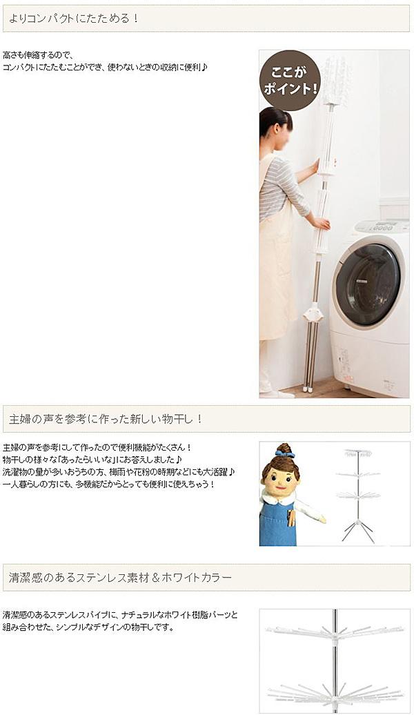 ●清潔感のあるステンレスパイプに、ナチュラルなホワイト樹脂パーツと組み合わせたシンプルなデザインの物干しです。