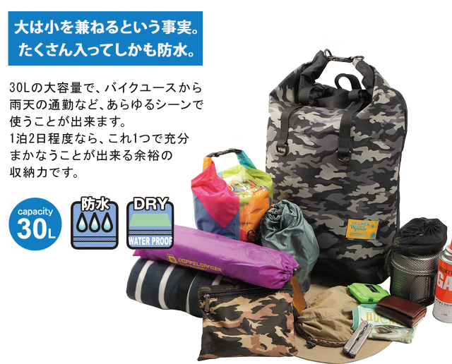30Lの大容量で、バイクユースから雨天の通勤など、あらゆるシーンで使うことが出来ます。