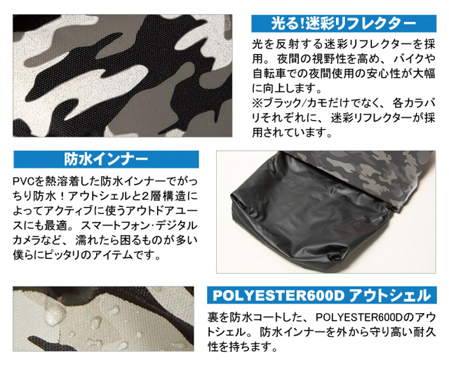 | 耐久性、品質、利便性等が高く評価された皮革製品を使用し、様々な革製品を生み出し続けるブランド、 DEGNER(デグナー)から「マルチプルレインバッグ」【NB-122】のご紹介です! 迷彩防水で、雨でも雪でも嵐でも。 光る迷彩×インナー防水仕様。何でも入る30Lの大容量バッグ! 大は小を兼ねるという事実。たくさん入ってしかも防水。 30Lの大容量で、バイクユースから雨天の通勤など、あらゆるシーンで使うことが出来ます。 1泊2日程度なら、これ1つで充分まかなうことが出来る余裕の収納力です。 【光る!迷彩リフレクター】 光を反射する迷彩リフレクターを採用。 夜間の視野性を高め、バイクや自転車での夜間使用の安心性が大幅に向上します。 【防水インナー】 PVC(ポリ塩化ビニル)を熱溶着した防水インナーでがっちり防水。 アウトシェルと2重構造によって、アクティブに使うアウトドアユースにも最適。 スマートフォン・デジタルカメラなど、濡れたら困るものが多い方にぴったりのアイテムです。 【ポリエステル600D アウトシェル】 裏を防水コートした、ポリエステル600Dのアウトシェル。 防水インナーを外から守り、高い耐久性を持ちます。 カラーは3色。 シックなカラーリングのブラックカモに加えて、 ポップなカラーリングが魅力的なイエローカモ、レッドカモをご用意致しました。 ※本製品は構造上、完全防水ではありません。 こちらの商品はお取り寄せとなりますので、ご注文受け付けより約3〜5日でお届け致します。 |