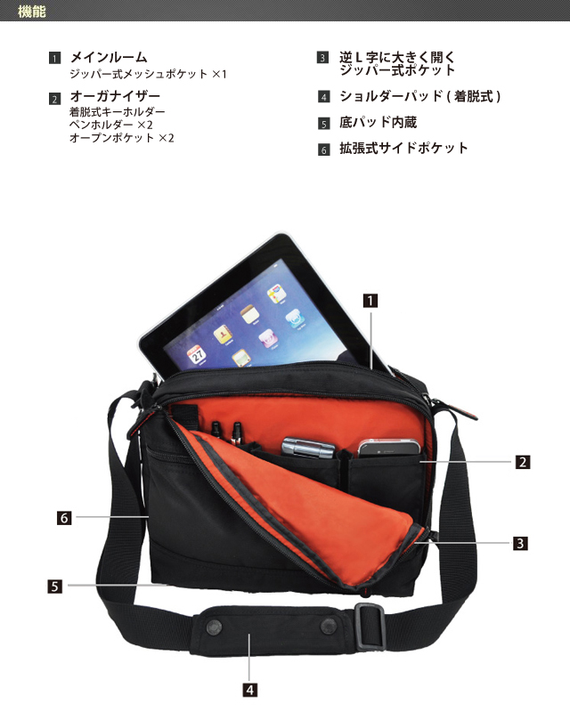 収納物を取り出しやすい逆L字に大きく開くジッパー式ポケット