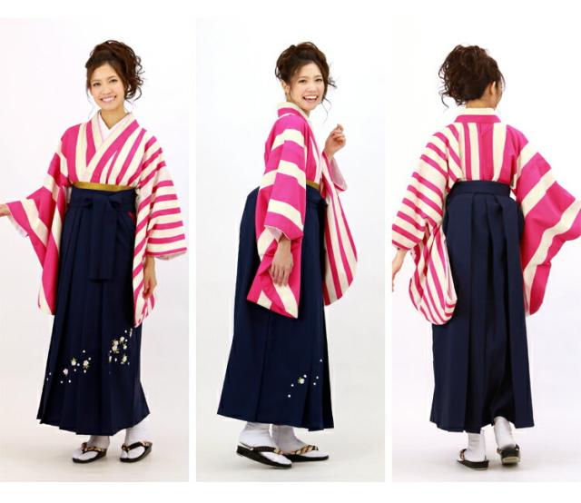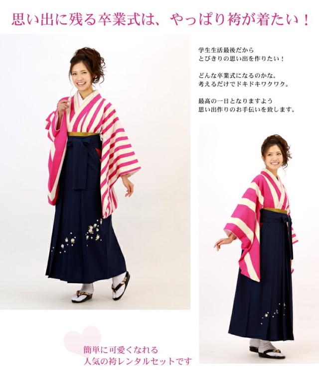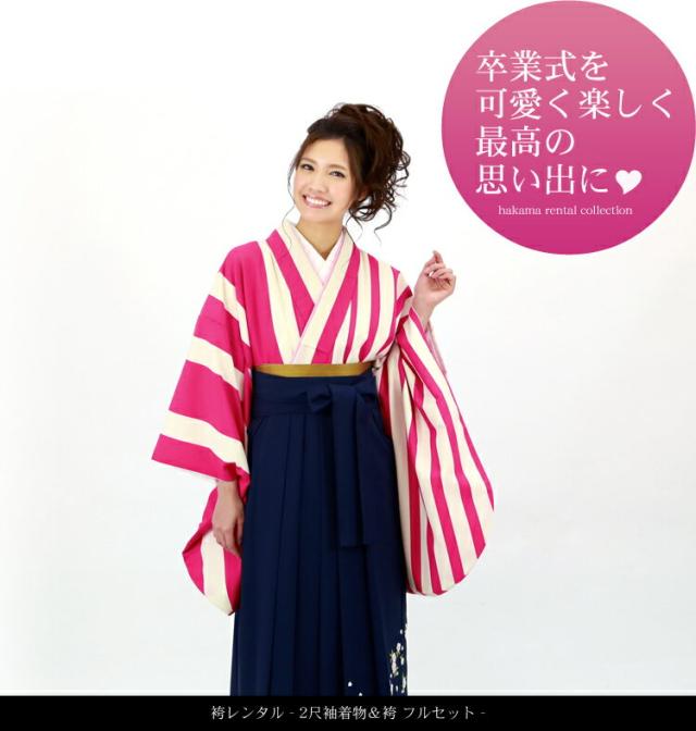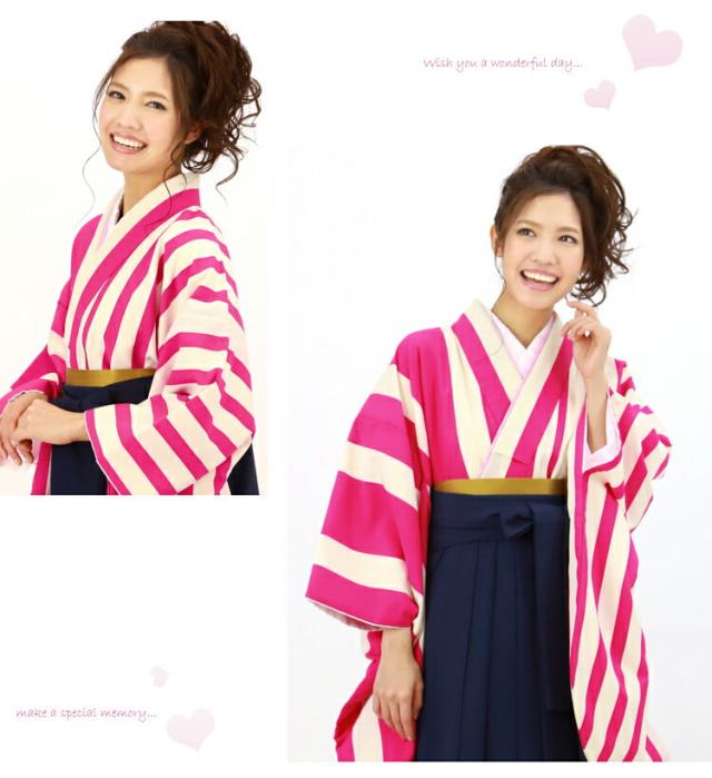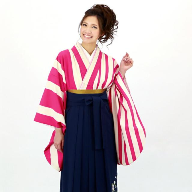 卒業式 袴 レンタル 女 袴セット 女 2尺袖着物&袴 フルセットレンタル 安い 「生成り地にピンクの変わり縦縞 ストライプ」
