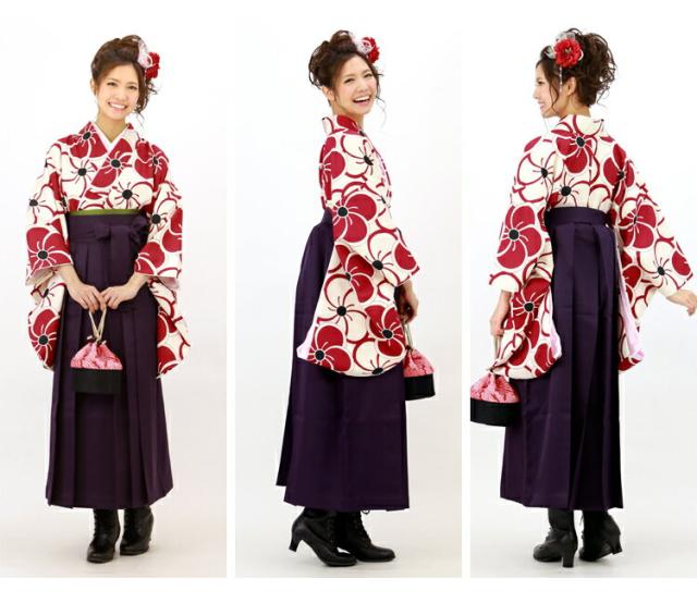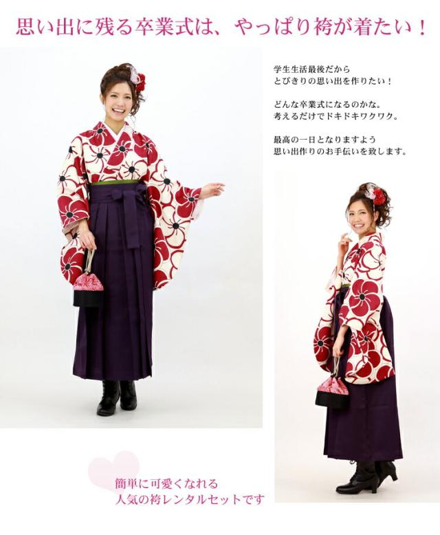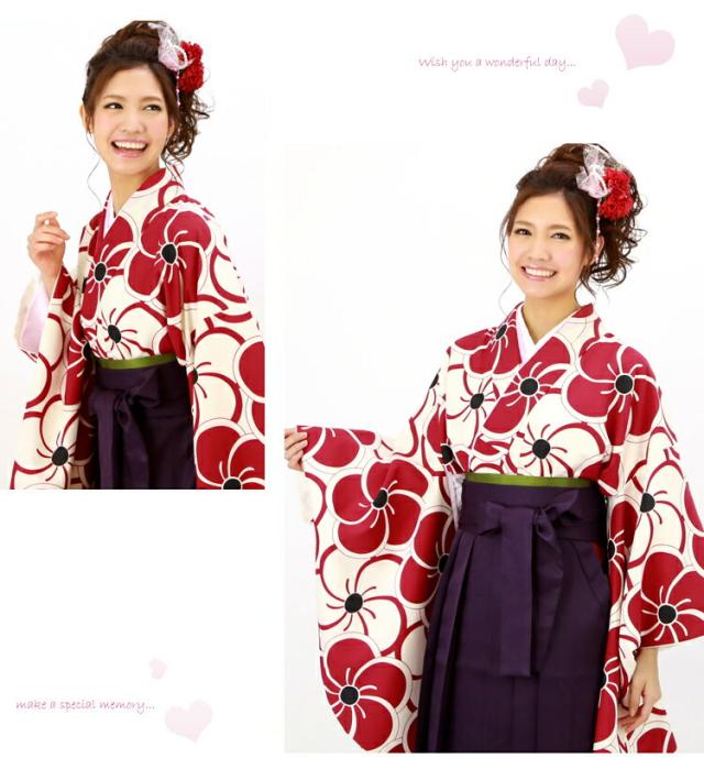 卒業式 袴 レンタル 女 袴セット 2尺袖着物&袴 フルセットレンタル 安い 「生成り地に赤のねじり梅 レトロ」
