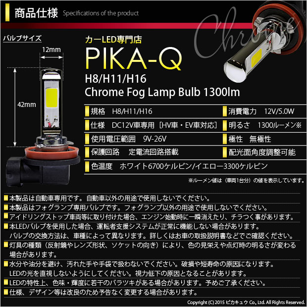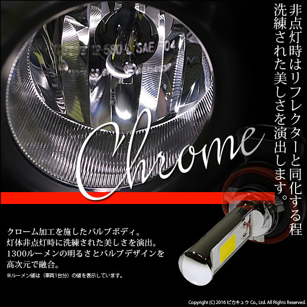 | Chrome Fog Lamp Bulb 1300lm ドライバー内蔵クロームLEDドレスアップフォグバルブ 明るさ:1300ルーメン LEDカラー:ホワイト6700K・イエロー3300K バルブ規格:H8/H11/H16兼用 | ||||