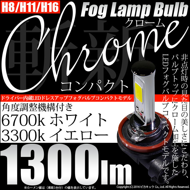 | LED,ピカキュウ,LEDバルブ専門店,COB,FOG,Chrome Fog Lamp Bulb 1300lm,ドライバー内蔵クロームLEDドレスアップフォグバルブ,ホワイト6700ケルビン,イエロー3300ケルビン,H8/H11/H16 |