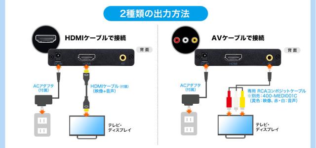付属のACアダプタを家庭用コンセントに挿します。メディアプレーヤー本体とテレビを接続します。