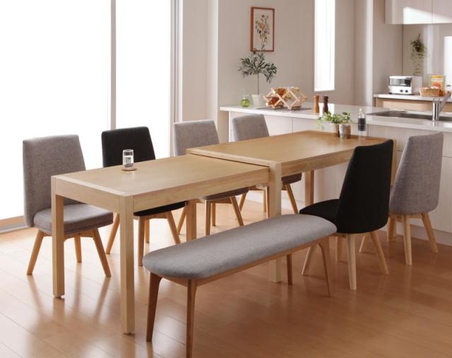 スライド伸縮テーブルダイニング 〔S-free〕エスフリー/8点セット(テーブル+チェア×6+ベンチ×1) 〔テーブル・脚〕ナチュラル 〔ベンチ〕ライトグレー 〔チェア6脚〕ダークグレー