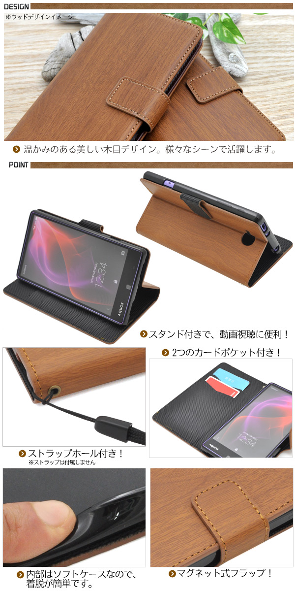 | 木目調のAQUOS ZETA SH-01H/AQUOS Xx2 502SH用スタンドケースポーチ。 衝撃やキズなどからAQUOS ZETA SH-01H/AQUOS Xx2 502SHを守ります。 また、内部はソフトケースなので着脱が簡単です。 背面を折り返すとスタンドとして使用できるので、動画視聴に便利です。 また、落下防止に最適なストラップホール付きです。 横開きタイプなので、手帳のように使うことができます。 内側に2つのカードポケットが付いています。 ※AQUOS ZETA SH-01H/AQUOS Xx2 502SHは付属しません。 ※ライセンス商品ではありません。 | ||||||||