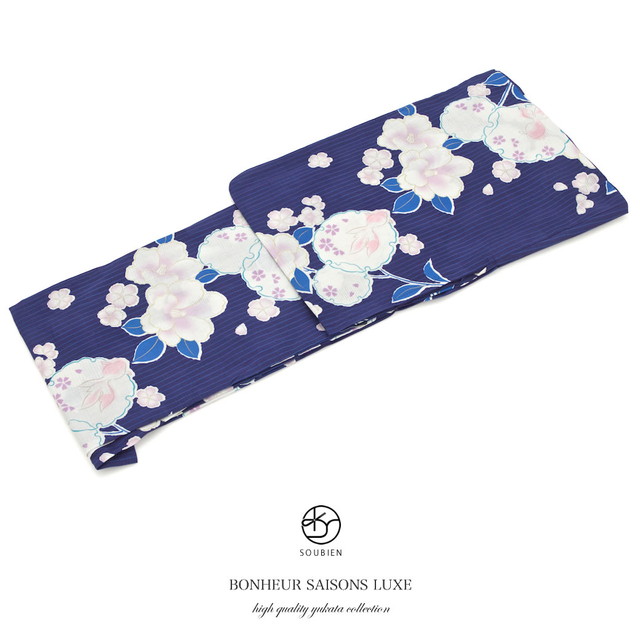 浴衣 レディース bonheur saisons ボヌールセゾン 紺青 ネイビーブルー 白 ホワイト 椿 つばき 雪輪 金魚 綿 縞 ラメ 夏祭り 花火大会 女性用 仕立て上がり 【フリーサイズ】【送料無料】