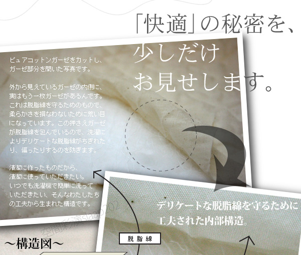 やわらかく丈夫なガーゼを使用。また、中綿には高吸水の脱脂綿を使用しているため、汗や水分を吸いやすく、また乾きも早いので、お洗濯が簡単です。また、「毛焼き」工程を行っておりますので、お洗濯を繰り返すことによる毛羽落ちを抑えます。無添加・無着色。安心の日本製です。
