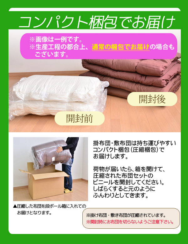 ※掛布団・敷布団・枕はコンパクト梱包(圧縮梱包)でのお届けとなります。