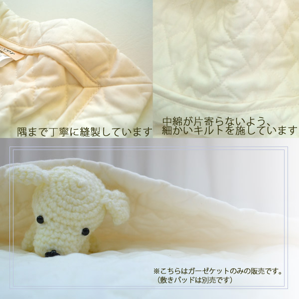 やわらかく丈夫なガーゼを使用。また、中綿には高吸水の脱脂綿を使用しているため、汗や水分を吸いやすく、また乾きも早いので、お洗濯が簡単です。また、「毛焼き」工程を行っておりますので、お洗濯を繰り返すことによる毛羽落ちを抑えます。無添加・無着色。安心の日本製です。