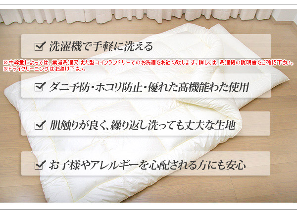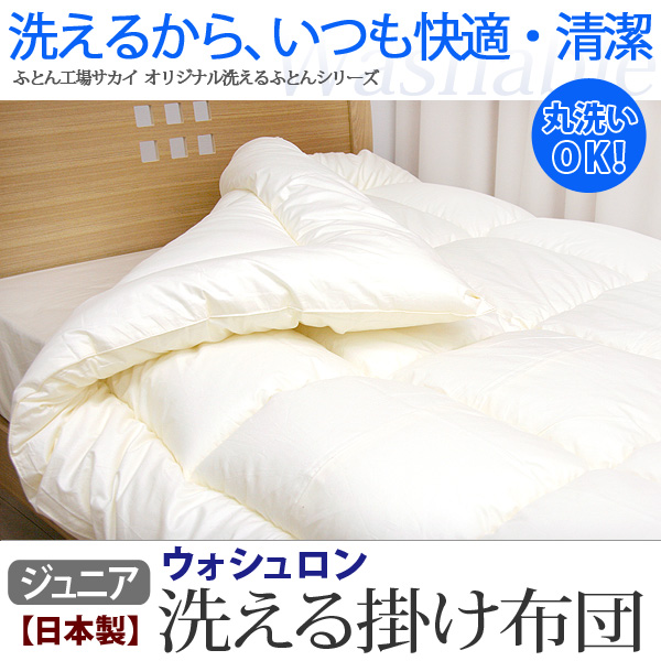 清潔・安心・ウォッシャブル!当店大人気「洗えるふとんシリーズ」のウォシュロン掛ふとん(ジュニアサイズ)です。お子様にはやっぱり清潔なお布団を使って頂きたいもの。ふんわり軽くて心地良いから、毎日ぐっすり