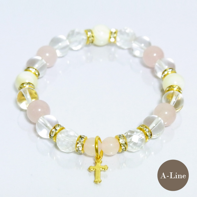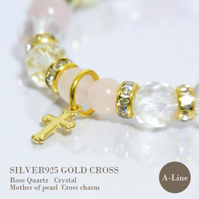 SILVER925製クロスチャーム(ゴールドメッキ・)64面カット水晶・ローズクォーツ&マザーオブパール・水晶8mm・ローズクォーツ6mm・国産高級オペロンゴム