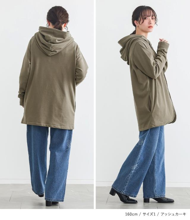 | 「小さいさん」 150cm/41kg B79 W60 H80 普段はS またはMサイズ着用。 | 【1(M〜L)】 ◆着丈:ヒップがすっぽり隠れる位 ◆袖丈:指先まで隠れる位 【2(LL〜3L)】 ◆着丈:膝上10cm位 ◆袖丈:10cm程長い位 2(LL〜3L)は全体的にゆったりしています。私の場合、1(M〜L)の方が程よいゆとりがあり、可愛く着られました。 |