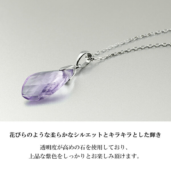 滑らかな曲線を描くツイストカットのアメジストを留めた、とてもシンプルなネックレスです。