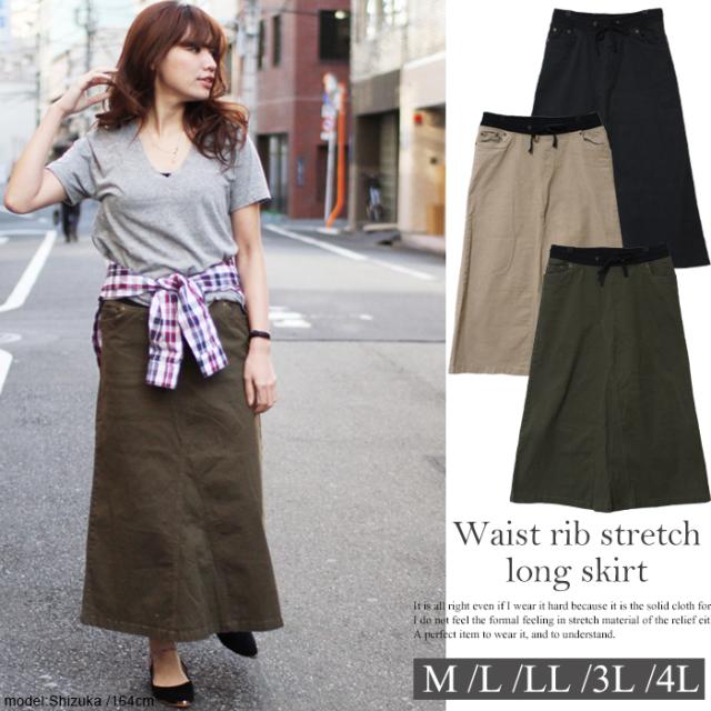 秋新作 大きいサイズ レディース ストレッチツイルロングスカート膝下 マキシ ストレッチ 伸縮 伸び ゆったり 大きいサイズ カーキ ベージュ ブラック M L LL 3L 4L レディース