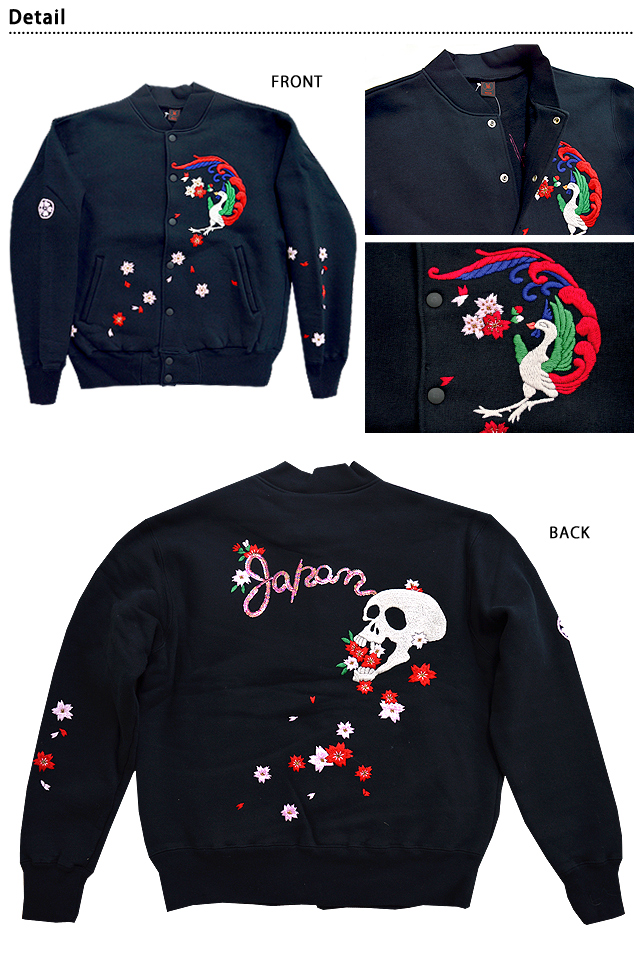 | 和の美意識を凝縮し、洋と引き合わせる。究極の和洋折衷を可能にしたクロップドヘッズさんから、 「スカ刺繍スウェットスカジャン(411-107)」のご紹介です。 刺繍にビーズを加えてポップにアレンジした、スウェットスカジャンが登場! 裏起毛仕様の肉厚なスウェットをボディーに採用し、秋冬のアクセントにもぴったりの1着です。 フロント左胸には、イラスト調に表現された鳳凰を配置。 身頃、左袖には、中央にビーズをあしらった桜がバランス良く描かれています。 バックには、上部に「Japan」ロゴをデザイン。 スカルと桜を組み合わせ、スパイスの効いたバックスタイルを完成させました。 右袖には、ワンポイントで桜家紋が刺繍で落とし込まれています。 フロントはスナップボタン仕様。 襟元、袖口、裾にはそれぞれリブが縫い付けられており、野暮ったさを軽減。 両身頃にはポケットが取り付けられています。 カラーは2色。刺繍を引き立たせるため、落ち着いたトーンのボディーカラーを採用しました。 生地には綿100%のやや肉厚な、裏起毛仕様のスウェットを使用。 1枚で着るのにはもちろん、アウターなどのインナーとしてトレーナー感覚でも着用して頂くことが出来ます。 | |||||||||||||||