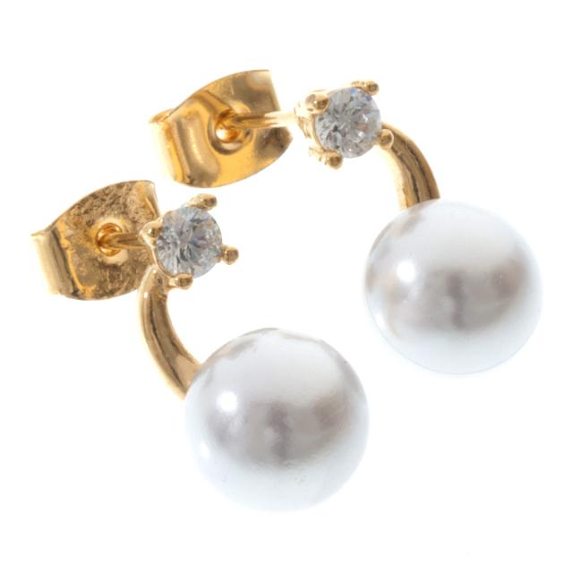 イミテーションパールがぶらさがったようなかわいらしいデザインのピアスです。