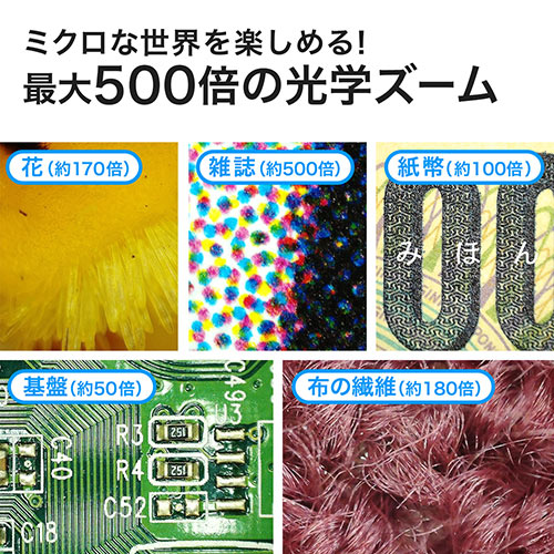 ●光学500倍まで拡大できる、モニタ付きのデジタル顕微鏡です。●光学ズームは20〜500倍、デジタルズームも4倍拡大できるので被写体の細部まで観察できます。