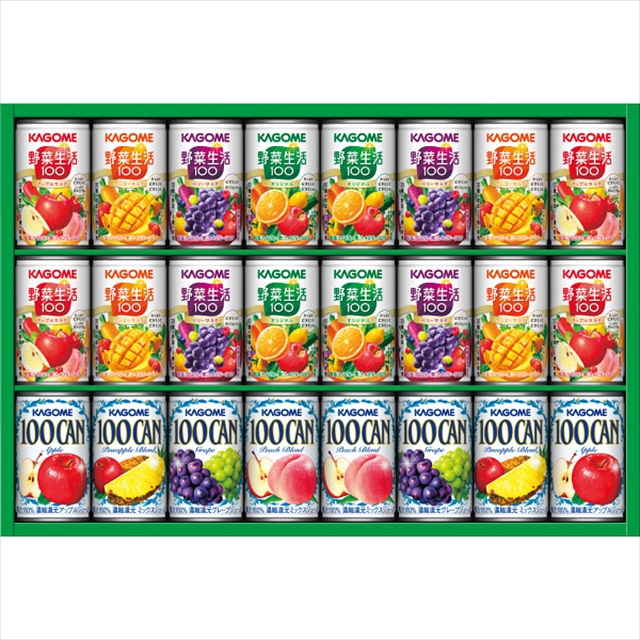 カゴメの100%フルーツジュースのベストセラー(1982年発売)「KAGOME100CAN」と野菜&フルーツのおいしさが人気の「野菜生活100」の詰め合わせギフトです。