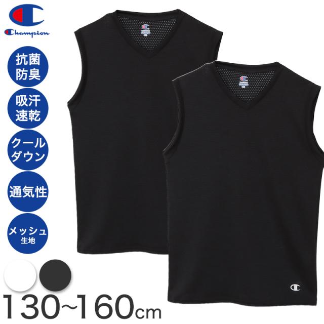 Champion キッズ インナー メッシュ ノースリーブ 男の子 Vネック 2枚組 130cm〜160cm 下着 tシャツ 子供 男子 肌着 吸汗速乾 スポーツ 白 黒 薄手
