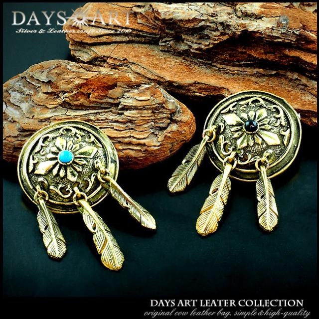 真鍮の味のあるゴールド色が特徴のブラスコンチョです。中央にはオニキス、ターコイズのワンポイントがあり、民族モチーフが刻印され3つのフェザーチャームが飾ります。バッグやベルトなどのカスタムにおすすめです。裏面はネジ式になっているので装着も簡単なカスタムコンチョです。