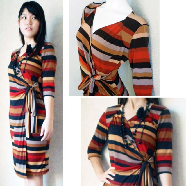ワンピースカシュクールレトロモードシリーズ煉瓦色ボーダー北欧モダンラップワンピパーティー二次会エレガント二の腕隠し五分袖伸縮性あ