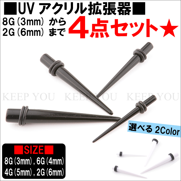 メール便 送料無料 UVアクリル 拡張器 エキスパンダー 4本セット 8G(3mm)〜2G(6mm) ブラック ホワイト ボディピアス ┃