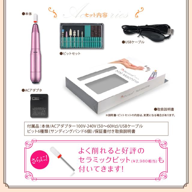 【付属品】USBケーブル/USB式アダプター100V-240V(50〜60Hz) /ビット6種類(サンディングバンド6個)※用途に合わせてビットをご使用ください。/取扱説明書・保証書