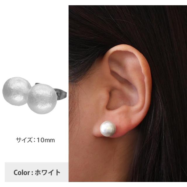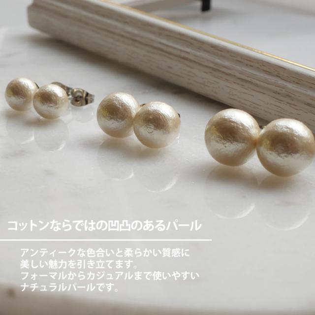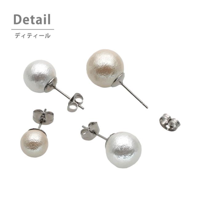 独特の風合いで人気のコットンパールのピアスが新登場♪コロンとした丸みのあるパールが可愛い!綿で出来ているのでとても軽く、着けていることを忘れてしまいそうです! 軸とキャッチ部分の素材には、金属アレルギーの方にも安心なサージカルステンレスを使用。使い勝手の良さとデザインが魅力的なステンレスピアスを是非お試しください。シルバーやホワイトゴールド、プラチナで金属アレルギーが出てしまう方にもオススメです。