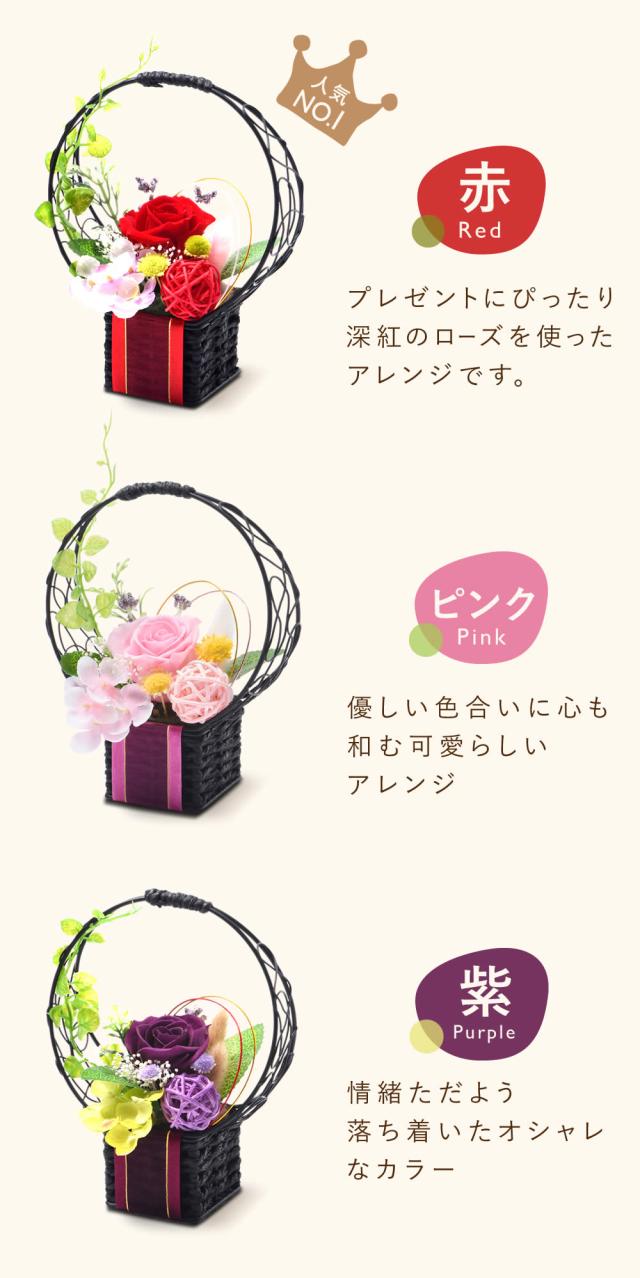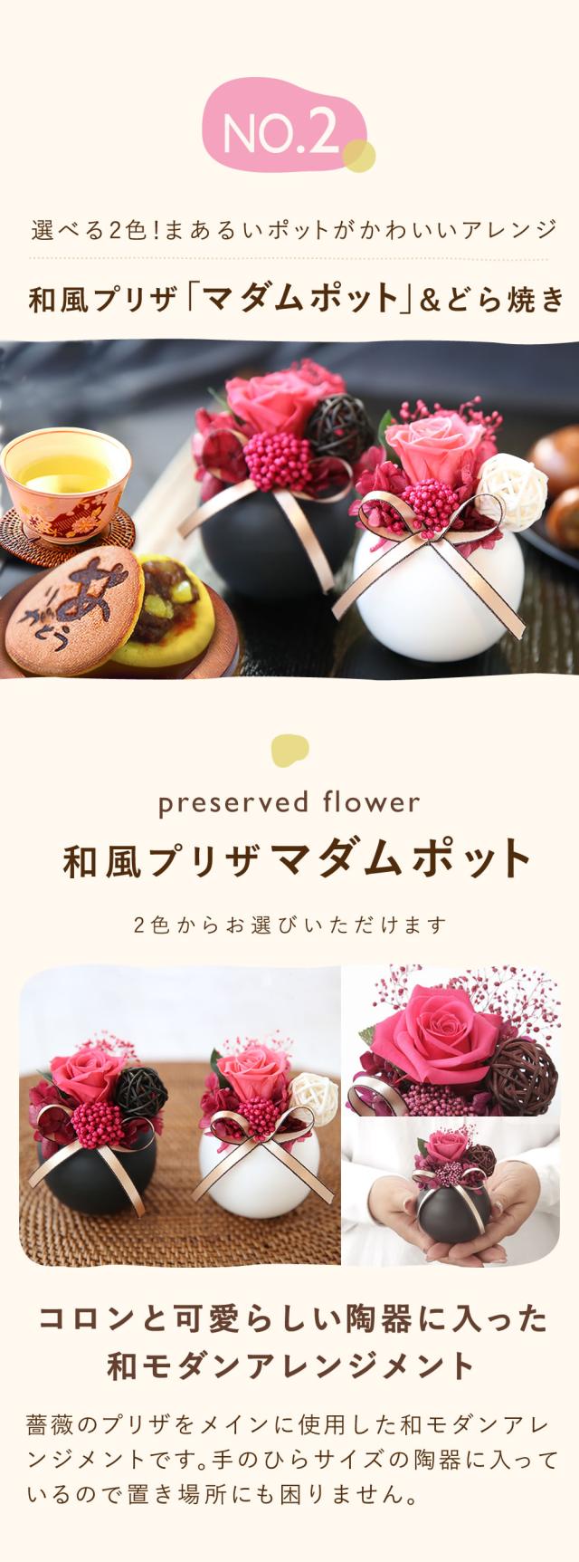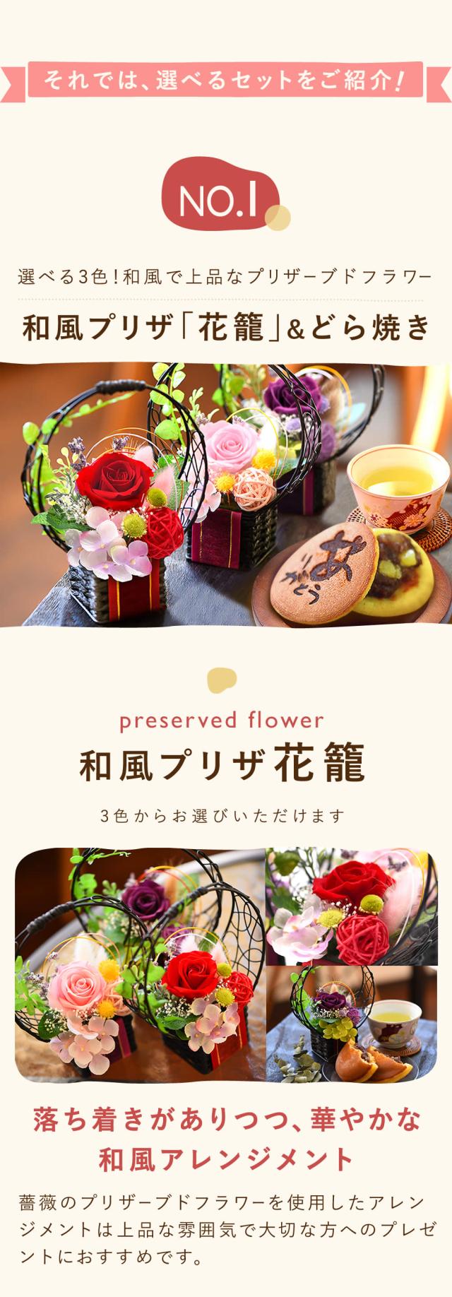 1.和風プリザ・花籠&どら焼きセット 2.和風プリザ・マダムポット&どら焼きセット |
