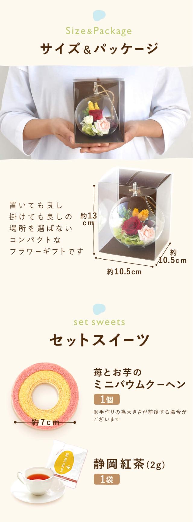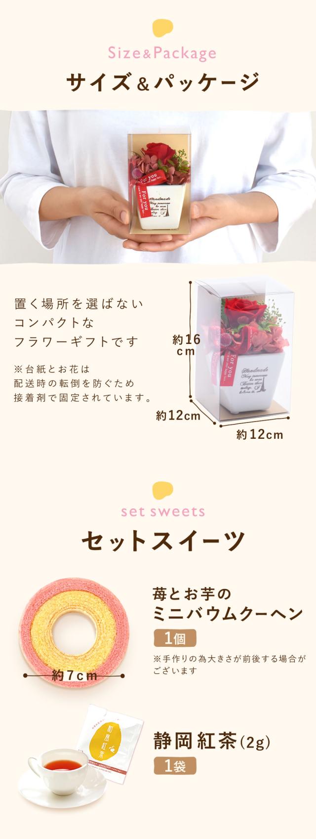 【プリザーブドフラワー 1個】 【苺とサツマイモのバウムクーヘン 1個】 常温で発送から約20日 卵(国産)、砂糖、ショートニング、マーガリン、小麦粉、乳等を主要原料とする食品、さつまいも、バター、苺果汁加工品、アーモンド加工品、さつまいもペースト、植物油脂、洋酒/加工澱粉、トレハロース、乳化剤、膨張剤、ソルビトール、香料、着色料(コチニール、ラック、カロチン)、酸味料、(一部に卵・小麦・乳成分・アーモンド・大豆を含む) 【静岡紅茶(2g) 1袋】 賞味期限:製造から約1年(未開封時)※パッケージ記載 原材料:緑茶(牧之原市) 【発送の温度帯】 常温便にてお届け |