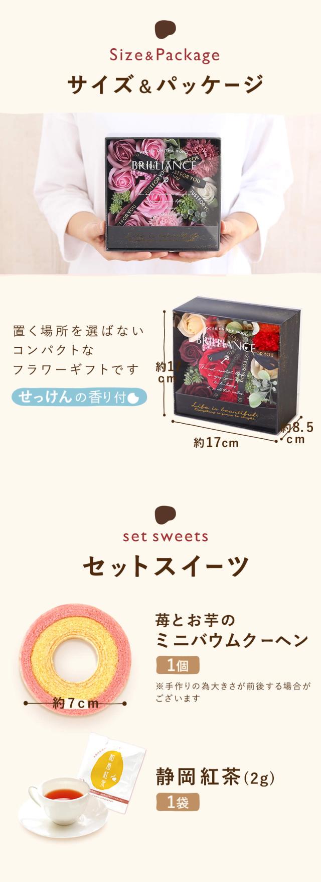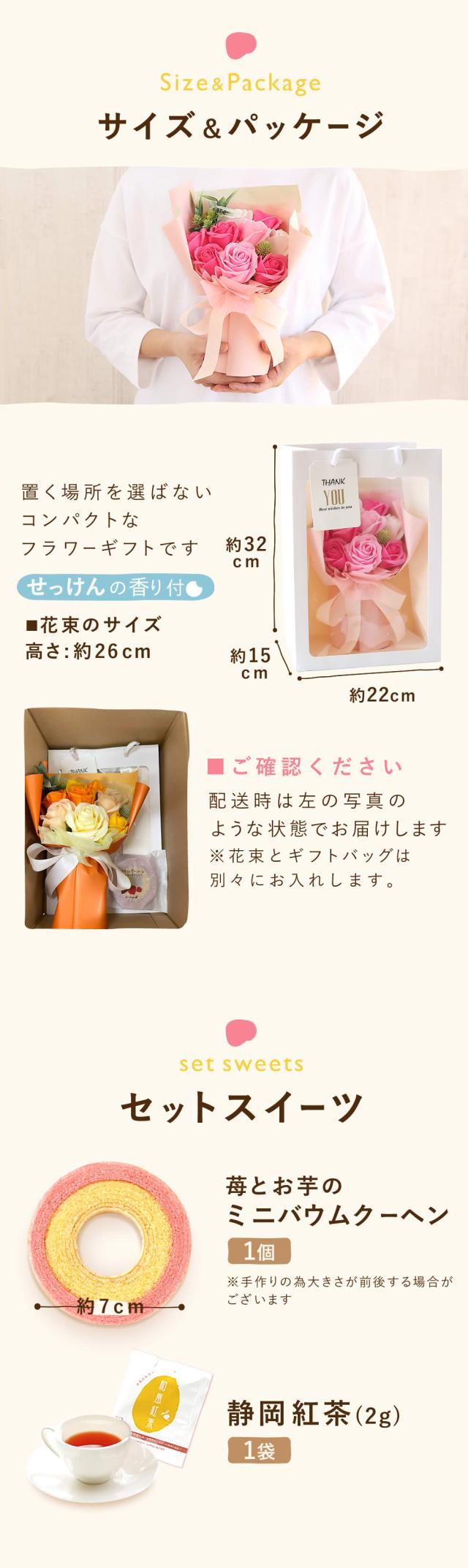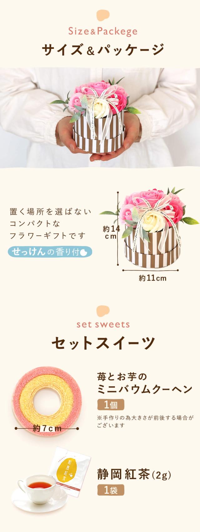 【シャボンフラワー 1個】 【苺とサツマイモのバウムクーヘン 1個】 常温で発送から約20日 卵(国産)、砂糖、ショートニング、マーガリン、小麦粉、乳等を主要原料とする食品、さつまいも、バター、苺果汁加工品、アーモンド加工品、さつまいもペースト、植物油脂、洋酒/加工澱粉、トレハロース、乳化剤、膨張剤、ソルビトール、香料、着色料(コチニール、ラック、カロチン)、酸味料、(一部に卵・小麦・乳成分・アーモンド・大豆を含む) 【静岡紅茶(2g) 1袋】 賞味期限:製造から約1年(未開封時)※パッケージ記載 原材料:緑茶(牧之原市) 【発送の温度帯】 常温便にてお届け |
