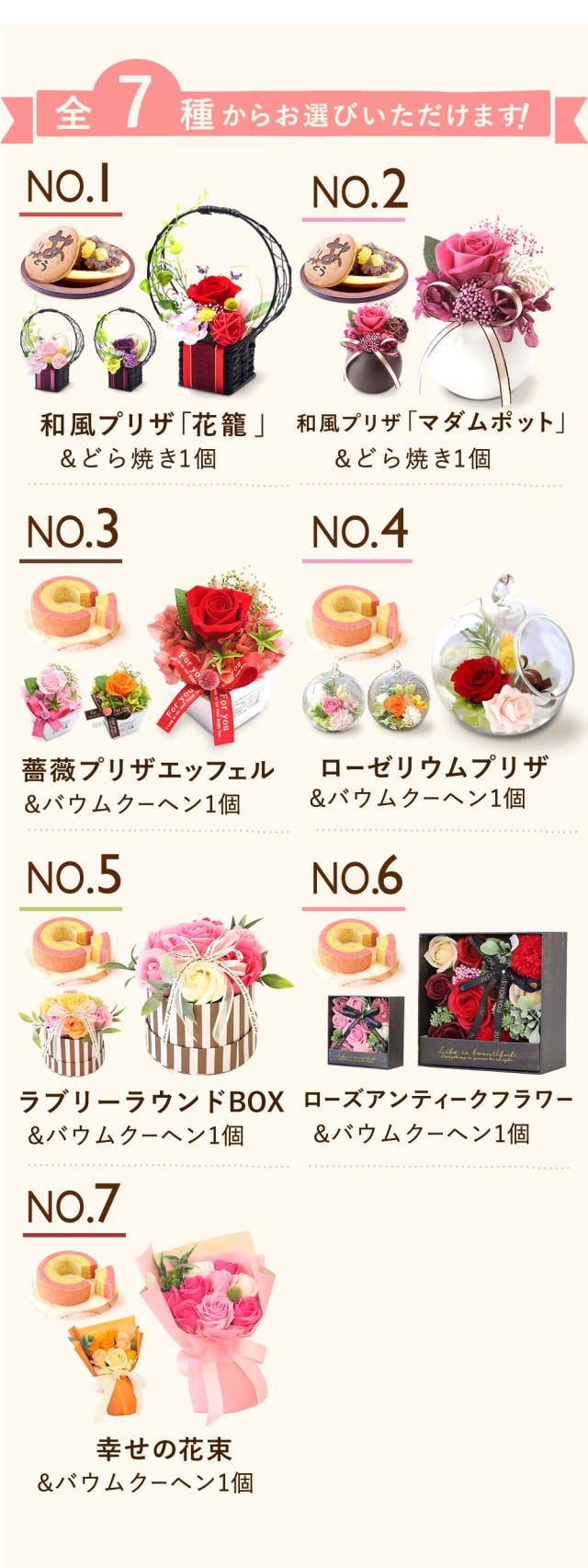 5.ラブリーラウンドBOX&スイーツセット 6.ローズアンティークフラワー&スイーツセット 7.幸せの花束&スイーツセット |