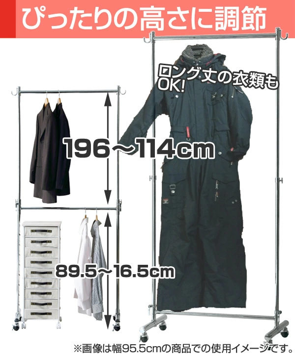 上下段のポールは別々に高さ調整が可能。収納場所に困るドレスやスキーウェアなどのロング丈の服をかける際は、下段を下げて、高さを確保して使用。お子様や背の低い方には、上段を下げて、取りやすい高さににするなど、使う方に合った収納スペースにできます。