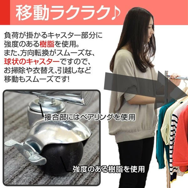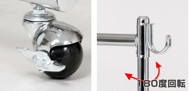 | 移動に便利なキャスター付 キャスターにはプラスチックより強度のある樹脂を採用。方向転換がスムーズな球状のキャスターで、お掃除や衣替えなど移動がスムーズです。 ストッパー付で、固定も可能です。 | サイドフック付き 180度回転するサイドフック付きで、ポールハンガー部分には掛けることができない、カバンや帽子などを掛けられます。 |