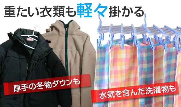コートやジャンバーなどの冬物衣料から、お洗濯で水分を含んだ重い衣類も安心して掛けていただくことができます。