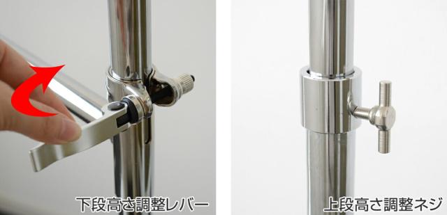 下段の高さ調整には自転車のサドルにも使用される、大型レバーを採用。ネジを締めた後、レバーでしっかりと固定できます。また、上段の高さ調整にはステンレス製の太いネジを採用し、しっかりと縦のポールに固定します。