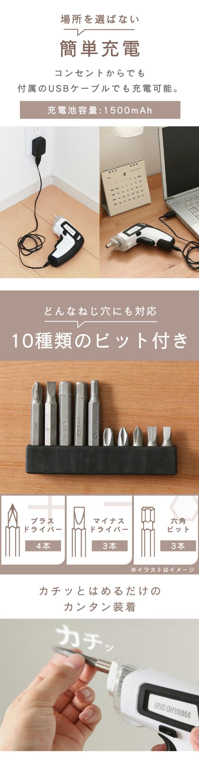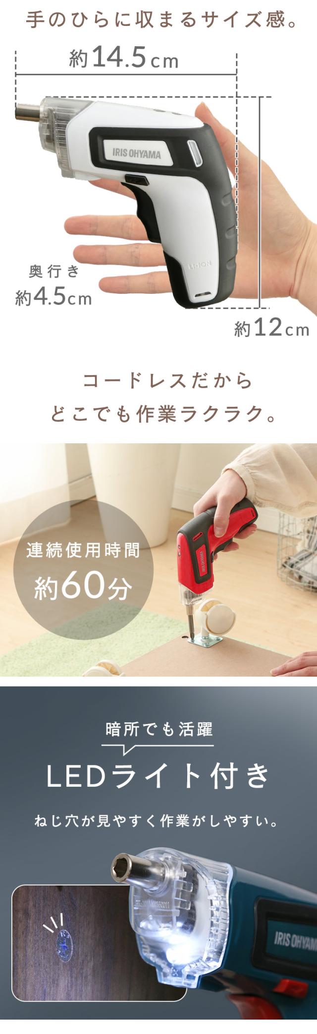 - 組み立て家具の金属とネジが硬くて回らないため、こちらを購入。以前使っていた大きいドライバーは重いし大きいし使いづらかったのですが、コンパクトなこちらは大変便利です。充電後、どの程度持つのかはまだ分から...