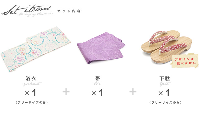 こちらの商品は、浴衣・帯・下駄の3点セットです。セット内容の一部変更や、それに伴う値引きは承っておりません。