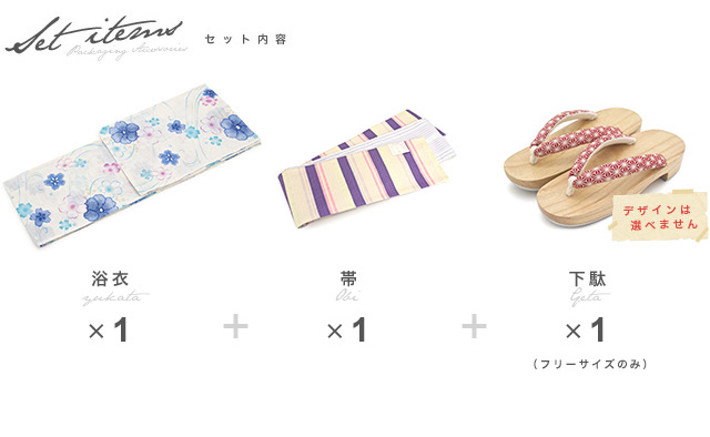 こちらの商品は、浴衣・帯・下駄の3点セットです。セット内容の一部変更や、それに伴う値引きは承っておりません。