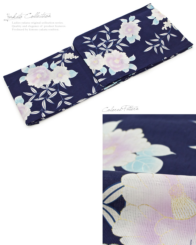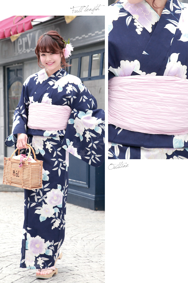浴衣セット レディース レトロ 浴衣セット 大人 3点セット 紺 ネイビー ピンク 椿 つばき 葉 ラメ 綿麻 兵児帯 女性 ボヌールセゾン