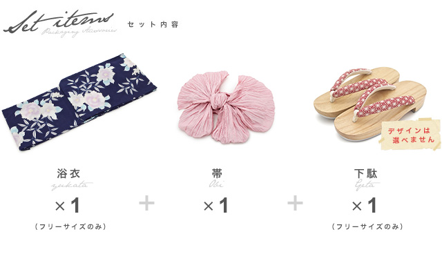 こちらの商品は、浴衣・帯・下駄の3点セットです。セット内容の一部変更や、それに伴う値引きは承っておりません。