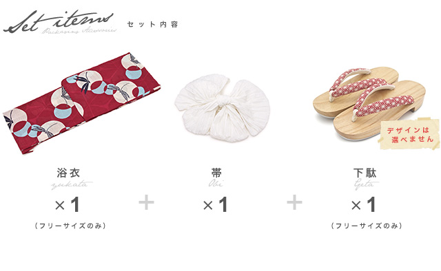 こちらの商品は、浴衣・帯・下駄の3点セットです。セット内容の一部変更や、それに伴う値引きは承っておりません。