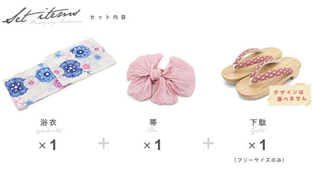 こちらの商品は、浴衣・帯・下駄の3点セットです。セット内容の一部変更や、それに伴う値引きは承っておりません。