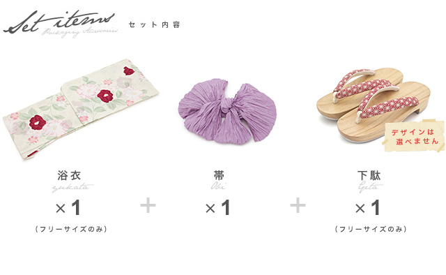 こちらの商品は、浴衣・帯・下駄の3点セットです。セット内容の一部変更や、それに伴う値引きは承っておりません。