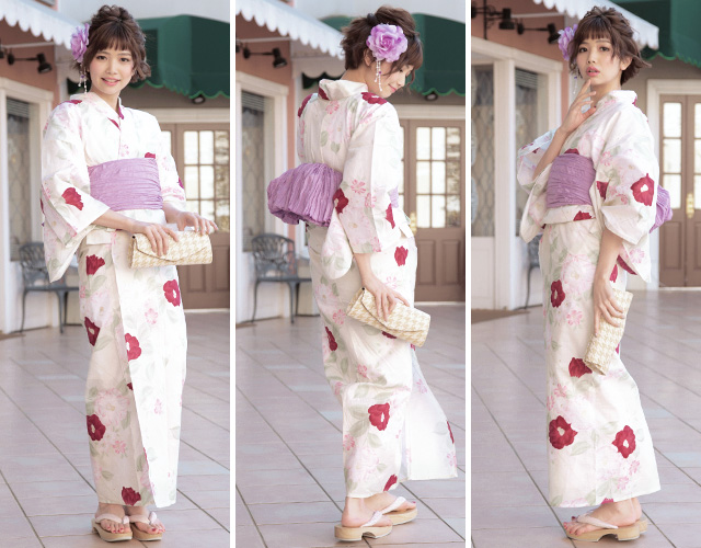 浴衣セット レディース レトロ 浴衣セット 大人 3点セット 白系 ホワイト 紫 椿 つばき 綿 紅梅 ラメ 兵児帯 女性 ボヌールセゾン