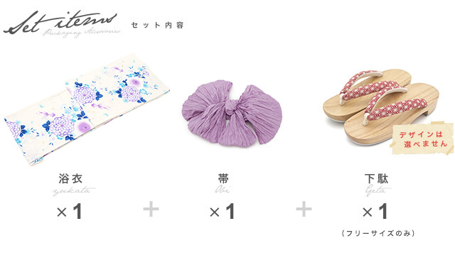 こちらの商品は、浴衣・帯・下駄の3点セットです。セット内容の一部変更や、それに伴う値引きは承っておりません。
