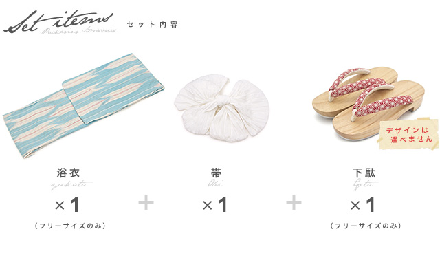 こちらの商品は、浴衣・帯・下駄の3点セットです。セット内容の一部変更や、それに伴う値引きは承っておりません。